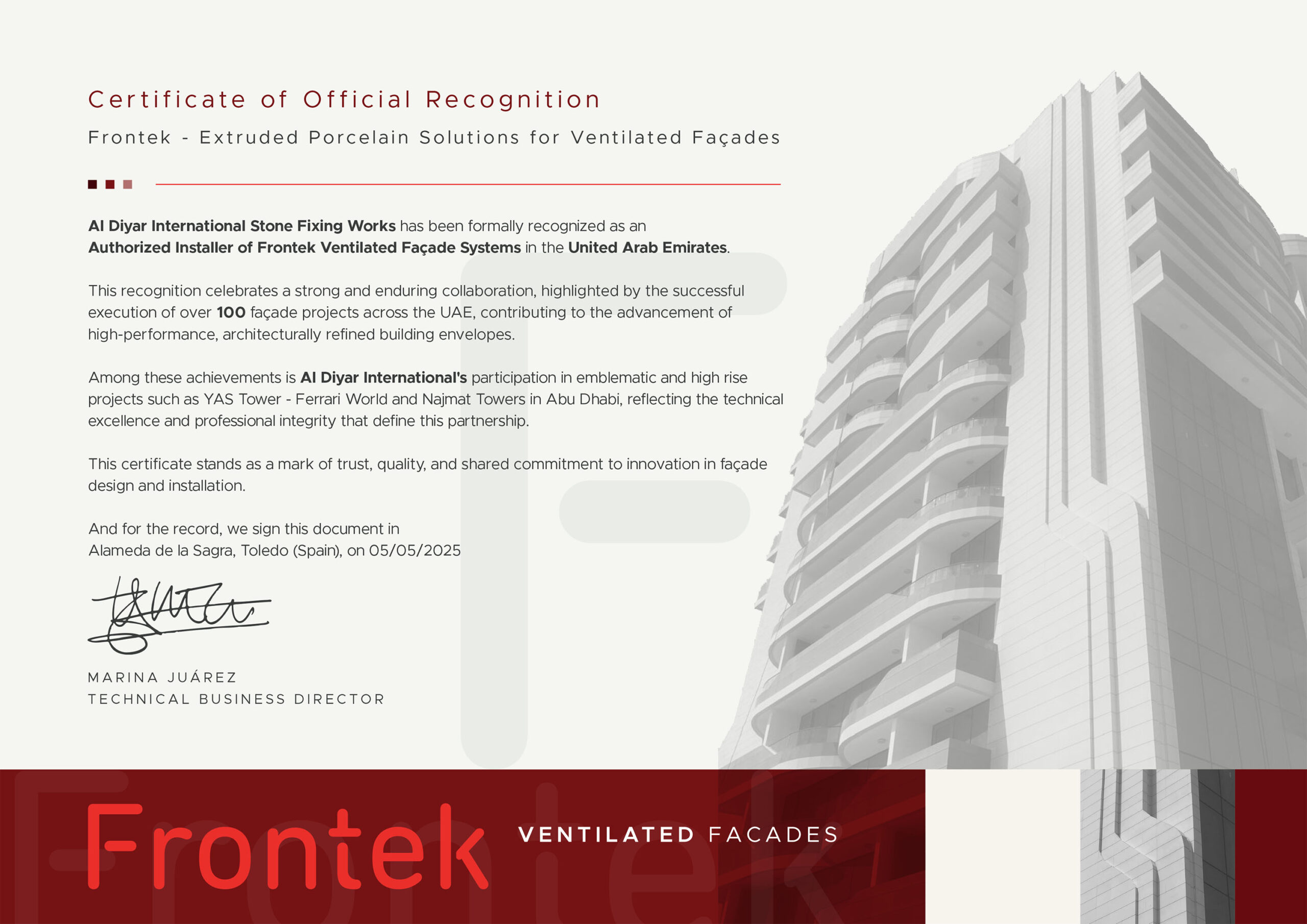 Our renowned products, Frontek and Atlas Concord, are premium porcelain ventilated systems that offer exceptional quality along with a variety of colors and textures. Our materials are certified and approved by Dubai and Abu Dhabi Civil Defence Authority and and recognized by third-party organizations.